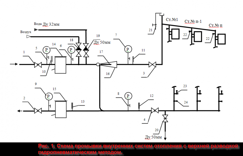 В системах отопления со схемой нижней разводки отопления, промывка осуществляется аналогично. Систему заполняют водой через задвижки 19;24 и 22, при этом кран 21 открыт.