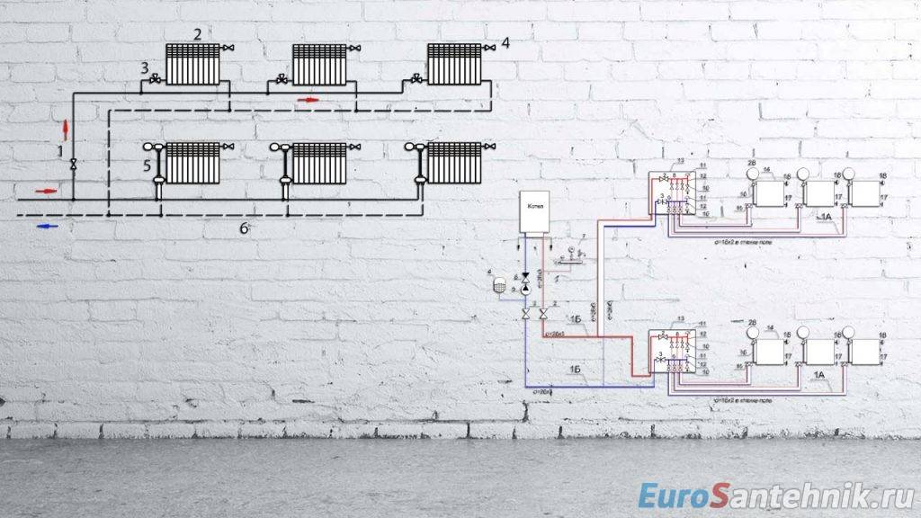 Традиционная одно- или двухтрубная система отопления без всяких затруднений монтируется на стенах. Такая разводка при лучевом коллекторном отоплении выглядит крайне не эстетично.