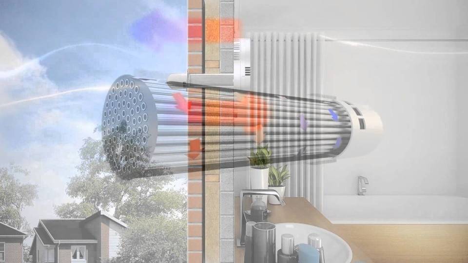 - Тёплый комнатный воздух из помещения нагревает холодный, поступающий извне.