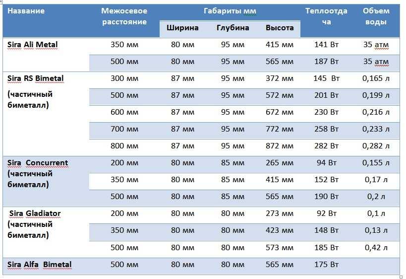 Технические характеристики алюминиевых радиаторов Sira сведены в таблицу. Диаметр коллекторов — один дюйм, рабочее давление — 16 атм