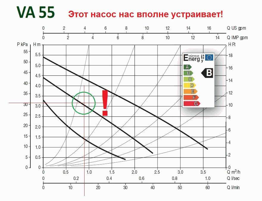 Рабочая точка насоса должна находиться в средней трети графика – эта зона является зоной максимального КПД насоса. Для подбора выбирайте график второй скорости, в этом случае Вы страхуете себя от недостаточной точности укрупненного расчета – у Вас останется резерв для увеличения производительности на третьей скорости и возможность ее уменьшения на первой.