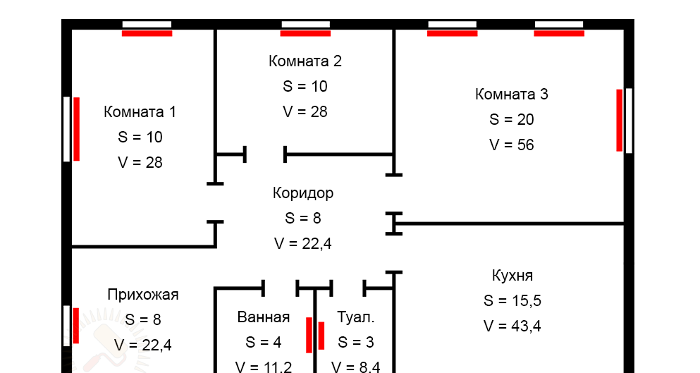 Предположим, что в нашем доме находятся 6 человек. Им требуется 0,54 * 6 = 3,24 куб. м воздуха в час. Считаем потерю тепла на вентиляцию: 15,5 * 3,24 = 50,22 Вт.
