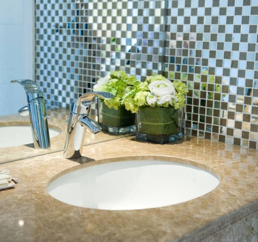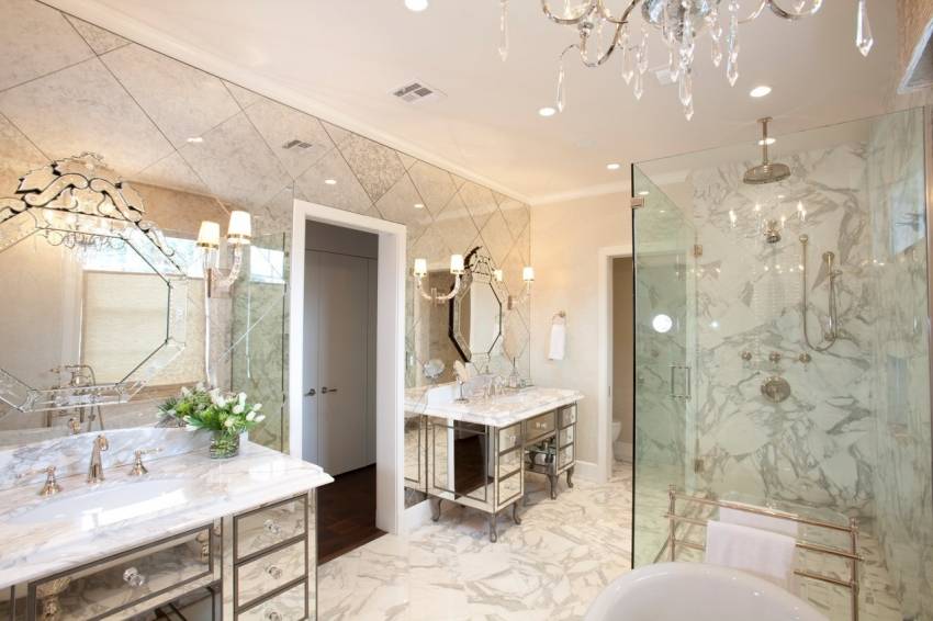 Зеркальную плитку с молочным отливом можно использовать в комбинации с мраморным покрытием