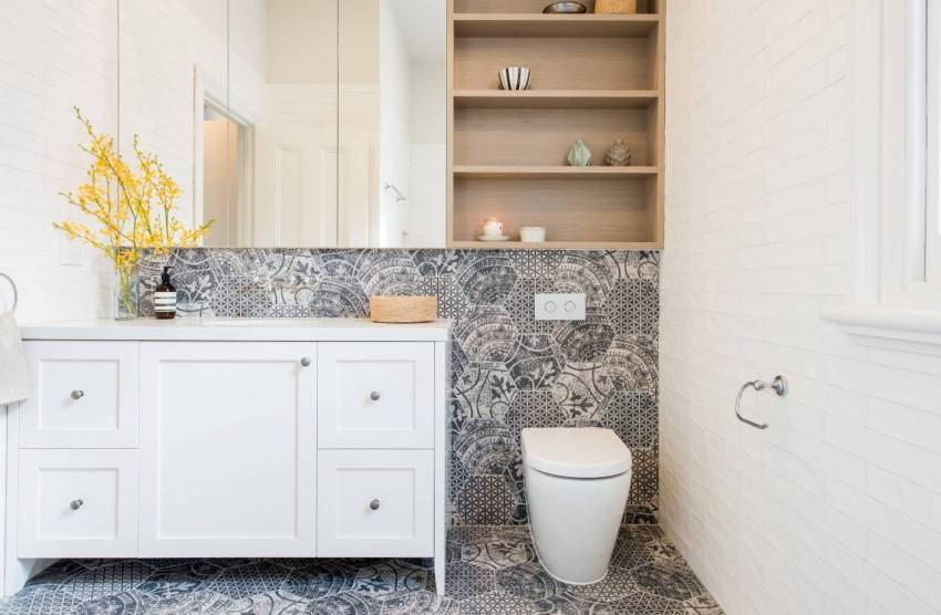 Орнамент в ванной комнате с коричневой и узорчатой плиткойИсточник design-vannoy.com