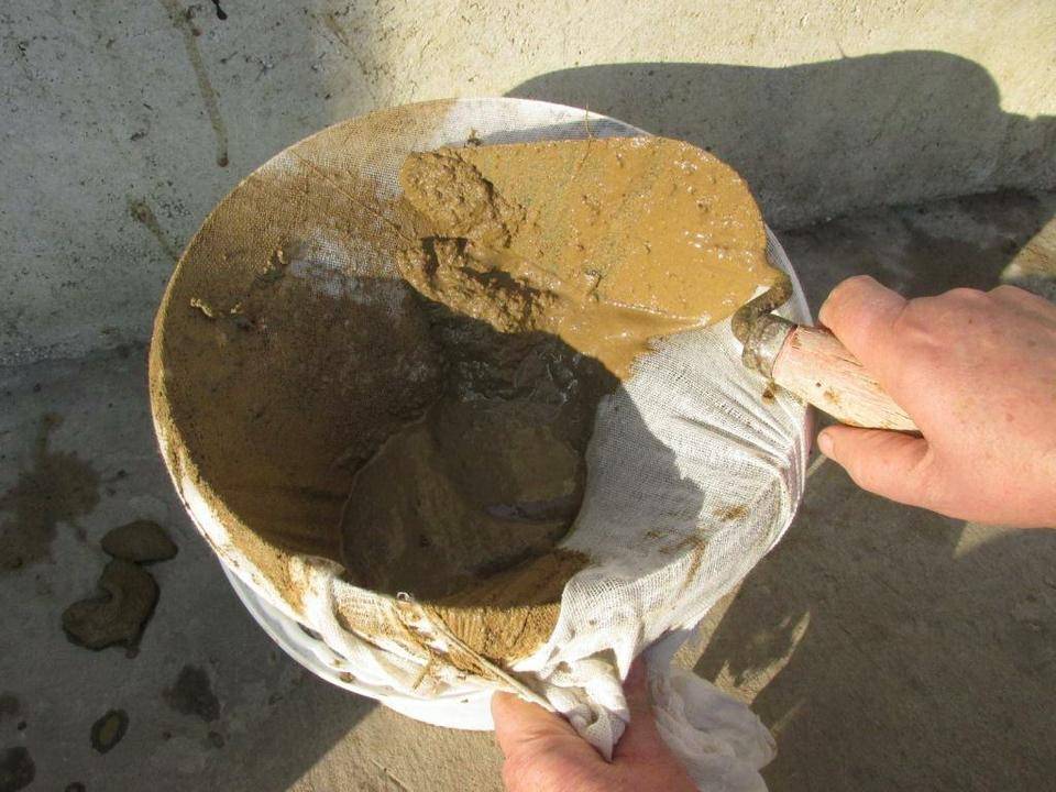 На 20-24 часа глину заливают водой (1:3), к утру примеси всплывут, а камешки осядут. Останется состав процедить через сито, слить лишнюю жидкость, чтобы получилась густая консистенция. Смешивают массу с чистым песком 1:1.