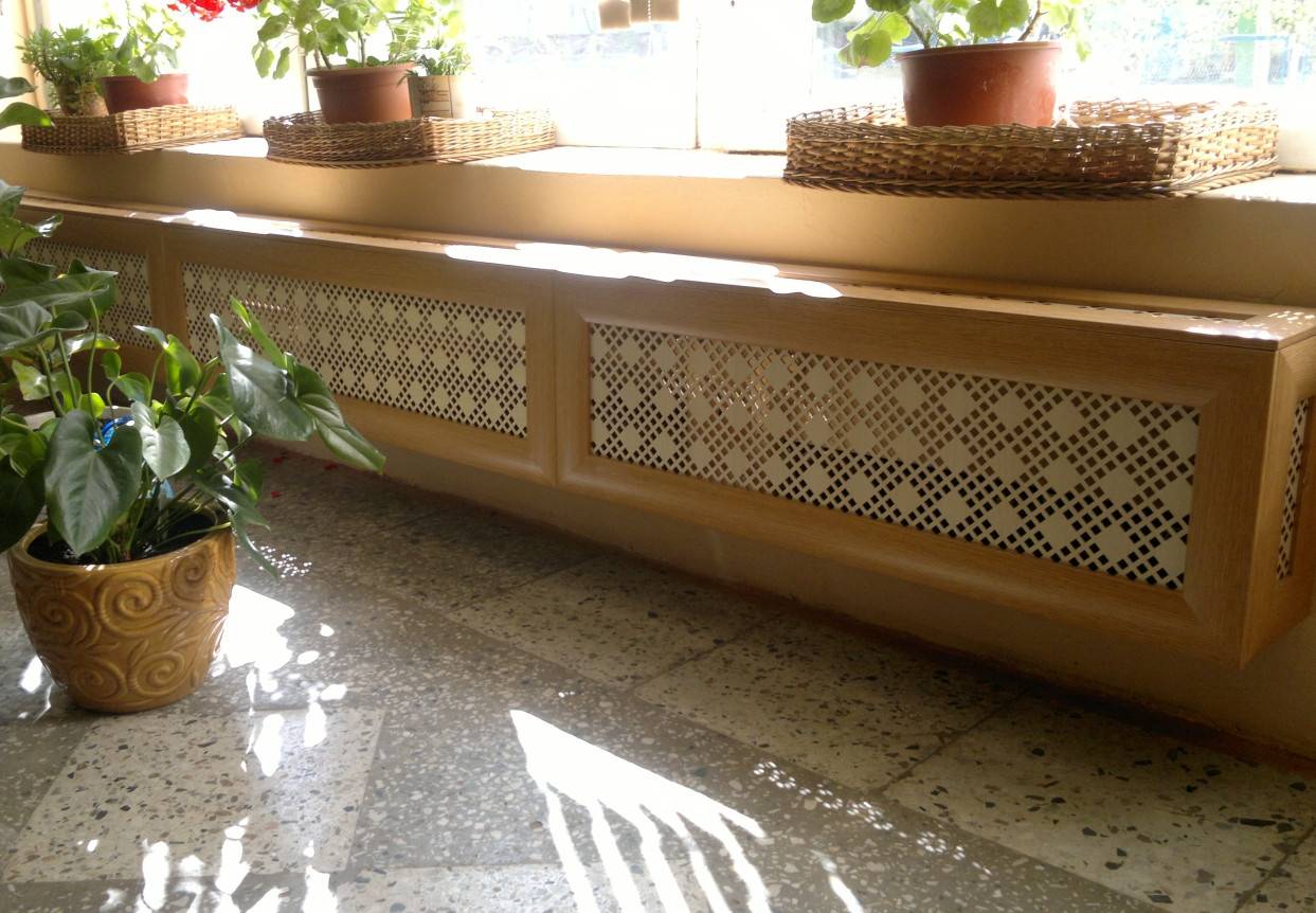 Особенно хороши деревянные решетки в детских учреждениях, где они закрывают все сантехнические элементы. Недорогие экраны изготавливаются из реечного полотна, хорошо пропускающего теплый воздух от радиаторов, и в то же время выполняют защитную функцию. Цена такого экрана начинается от 1400 р. за 1 м пог., при толщине рейки 28 мм, а вот уже покрытого лаком на водной основе будет 1600 р. за 1 м пог.