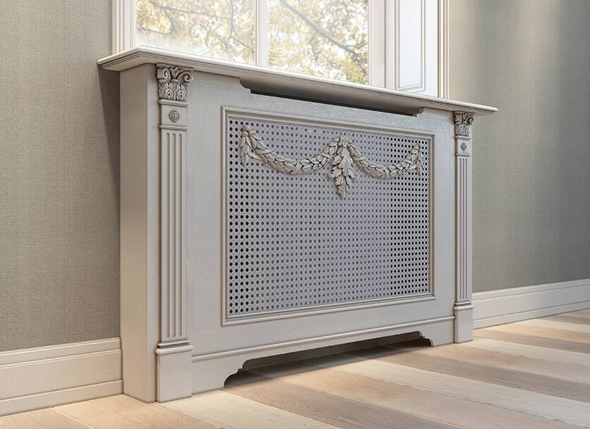 Открытая батарея сразу бросается в глаза и в квартире ее стремятся чем-то декорировать. Для этого приходят на помощь деревянные деревянные решетки, закрывающие старые чугунные батареи, они выполняются из натуральных пород деревьев бука и дуба. Такие экраны долговечны и надежны. Они могут быть: крашенными и нет, покрытыми эмалью или тонированы. Чтобы решетки не препятствовали прохождению тепла, их монтируют не на пол, а поднимают на некоторое расстояние над полом. Для лучшей циркуляции воздуха вверху на коробе делают отверстия.