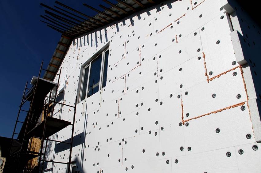 Монтажные работы ведутся рядами, начальная точка которых низ фасада. После выполнения монтажа утеплителя, сверху его покрывают специальной пленкой (Изоспан, Изовек и т.д). И только затем начинается работа по внешней отделке.