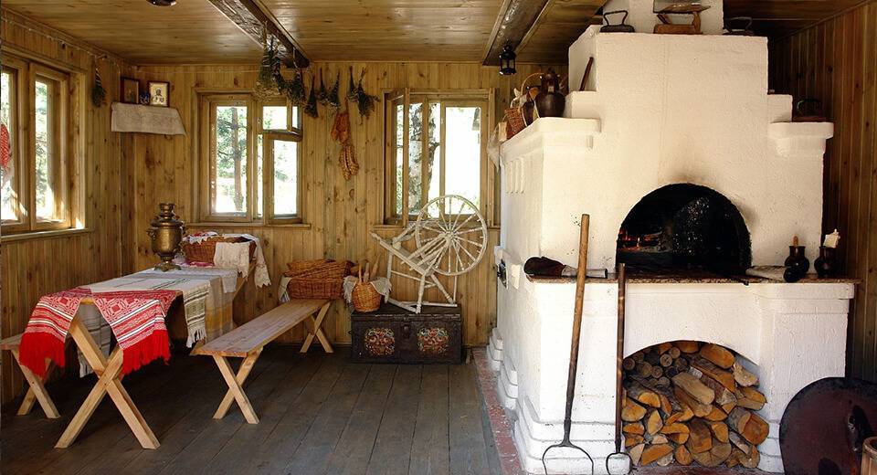 Центром избы была печь, которую называли царицей дома. Она занимала четверть или даже треть площади всего жилища. По углам печи ставили печные столбы, защищающие «царицу» от разрушения. На эти столбы и на стены опирались балки под потолком. Балки, говоря современным языком, зонировали пространство, деля избу на женскую половину, мужской и красный углы. На одной из балок устраивали полати — дощатый лежак, который облюбовывали дети.