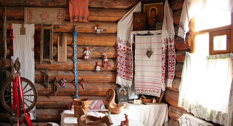 В русской избе была всего одна комната, которую хозяева делили на несколько частей. Обязательной частью избы был печной угол, который отделялся занавеской. Также отделялись зоны отдыха для мужчин и женщин. Все углы в доме выстраивались в соответствии со сторонами света и самым главным среди них был восточный (красный), где семья организовывала иконостас
