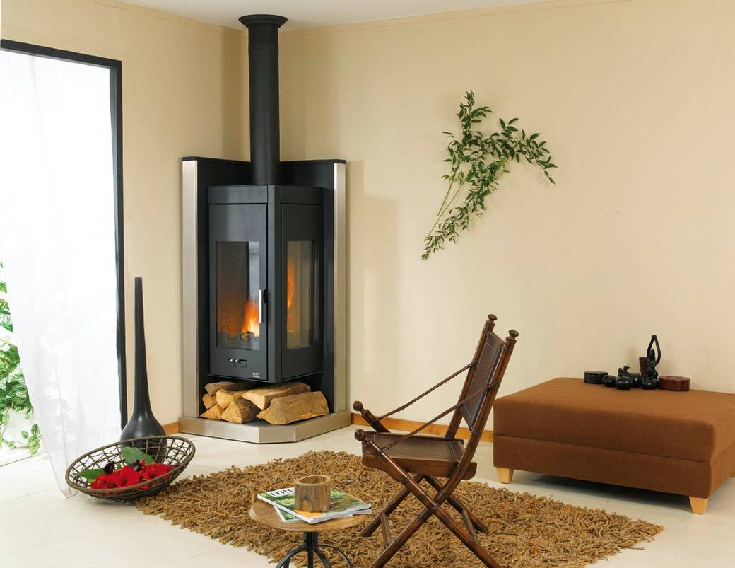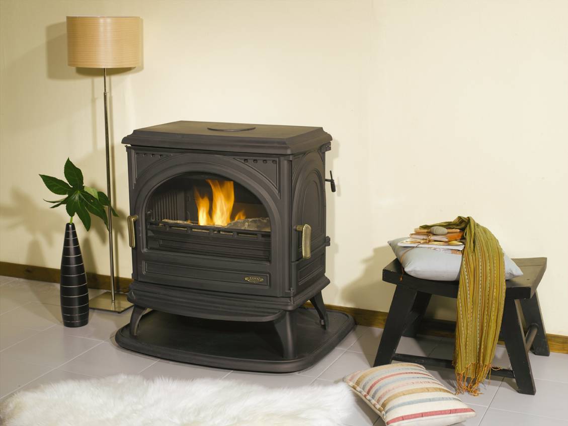 Такой прибор обогревает с помощью дров, пеллет или торфа, плотно уложенных внутри топки.