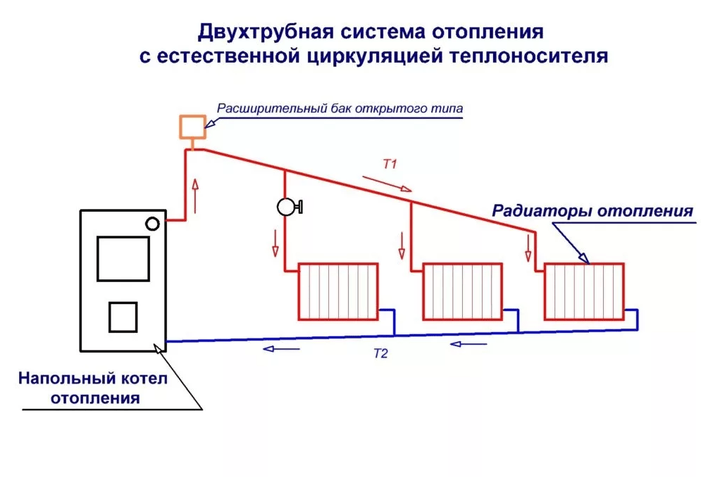 Двухтрубная система отопления в частном доме с естественной циркуляцией, имеет следующие конструктивные особенности: