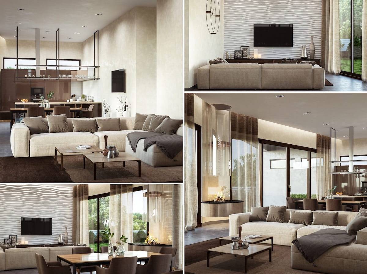 Более темная акцентная палитра построена на основе белого, молочного цвета. Это идеальный вариант для любителей минимализма: мы получаем теплый и уютный интерьер, при этом он не перегружен и не перегружен насыщенностью цвета.