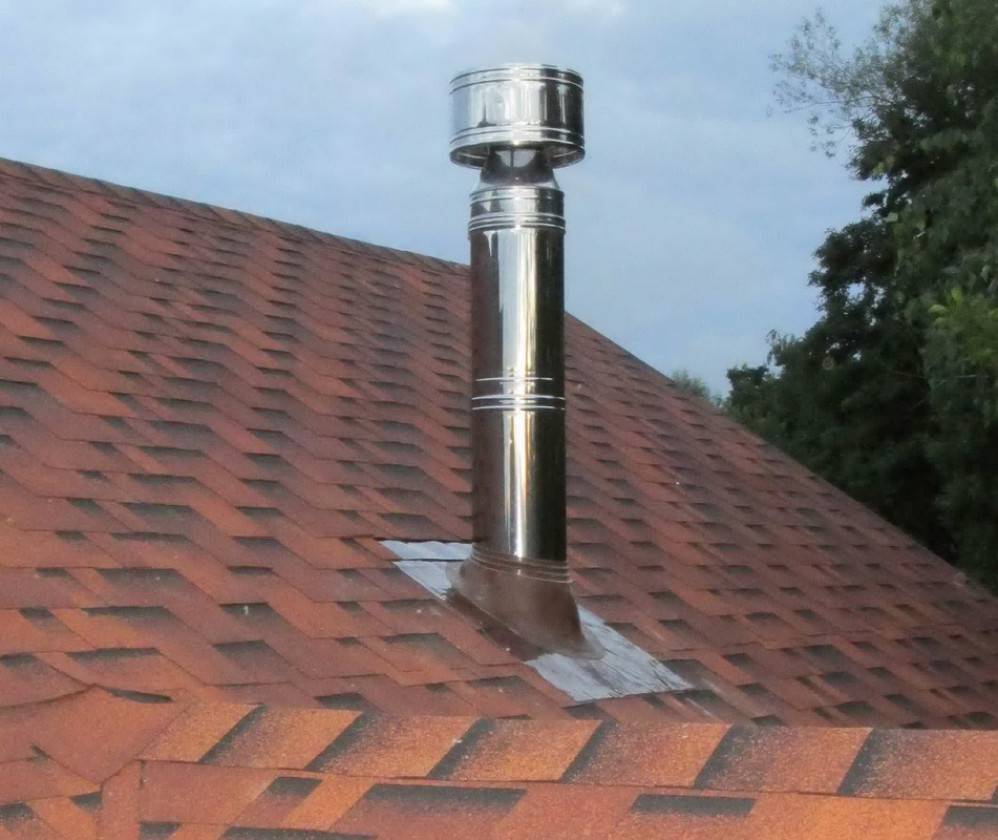 Элемент «разделка» надевается через трубу при этом края фиксируются и крепятся под коньком кровли. Труба выходит на полметра над крайней крышей, при ее компоновке в пределах 1,5 метров от пропета. Если промежуток составляет от 1,5 до 3 м, то крайняя точка трубы может располагаться на одной плоскости с коньком крыши. Если расстояние больше трех метров, то крайняя точка трубы располагается по схеме: