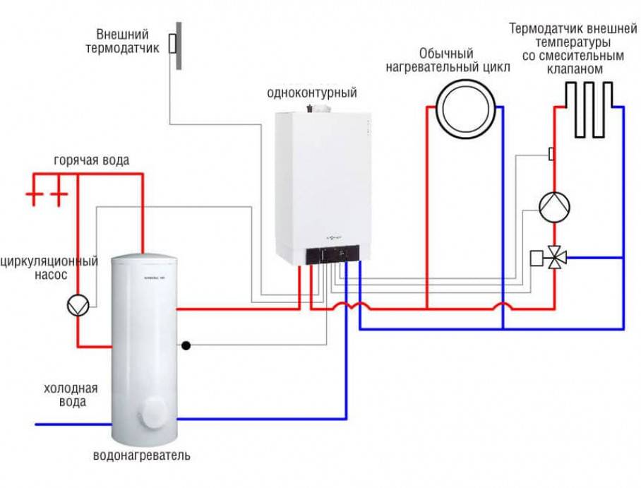 В зависимости от конструкции, может быть использовано подключение в разрыв линии подачи отопительного контура, или прямой выход ГВС из котла для накопления горячей воды в емкости.