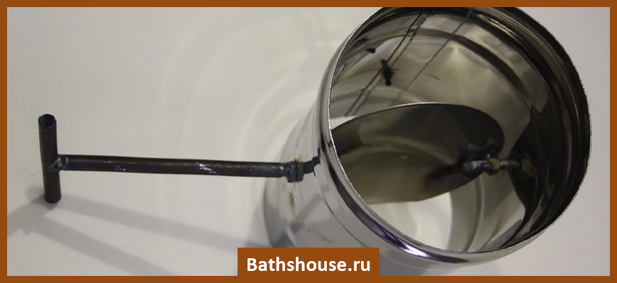 Опыт показывает, что такая конструкция позволяет провести более точные настройки, но менее надежна. В процессе эксплуатации сварные соединения ослабевают, и заслонка перестает реагировать на регулировку. Обычно поворотный механизм используется в стальных дымоходах.