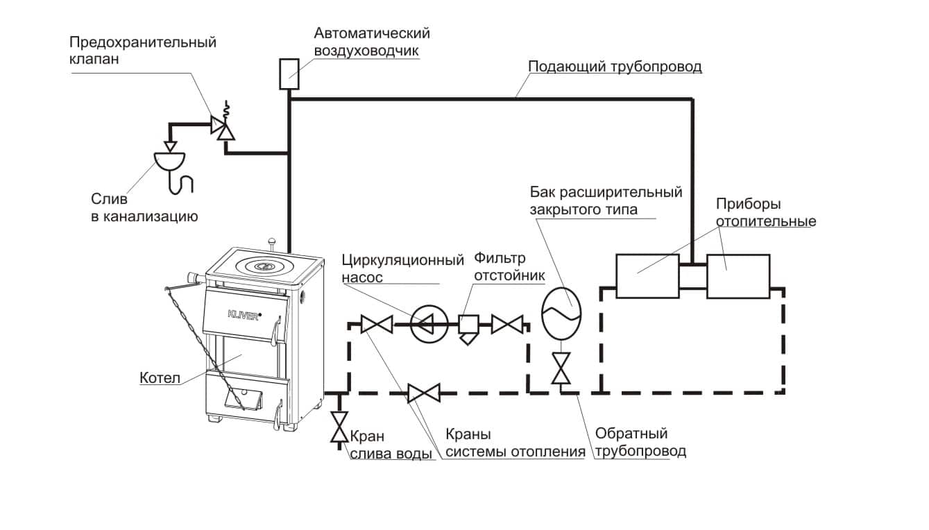 Если рассматривать более подробно контур с естественной циркуляцией теплоносителя, он будет содержать следующий набор элементов: