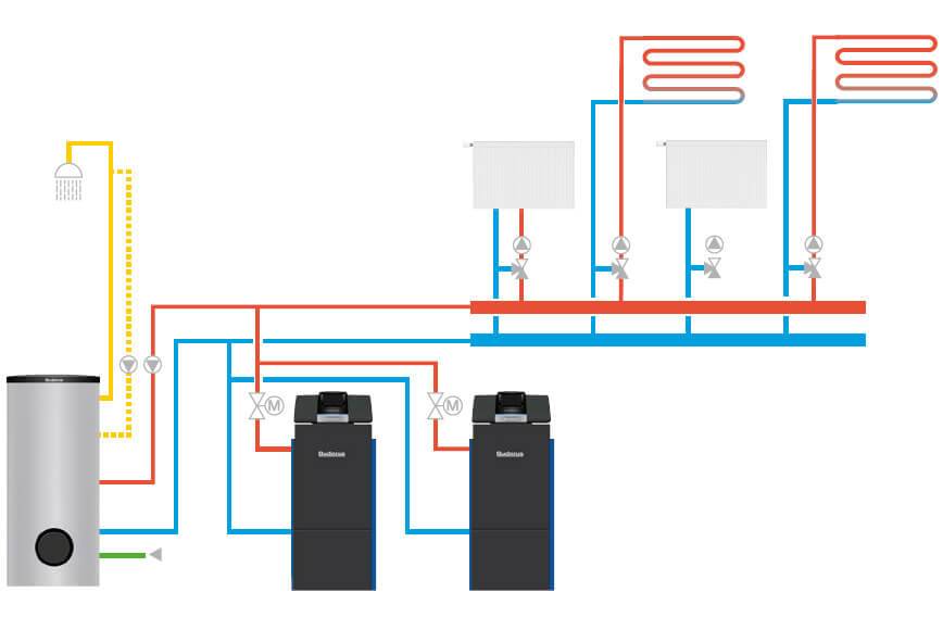 Последовательная, предполагает поочередное включение агрегатов без дополнительных линий и узлов. При этом первый по ходу движения воды агрегат нагревает ее, а второй — догревает до нужной температуры.