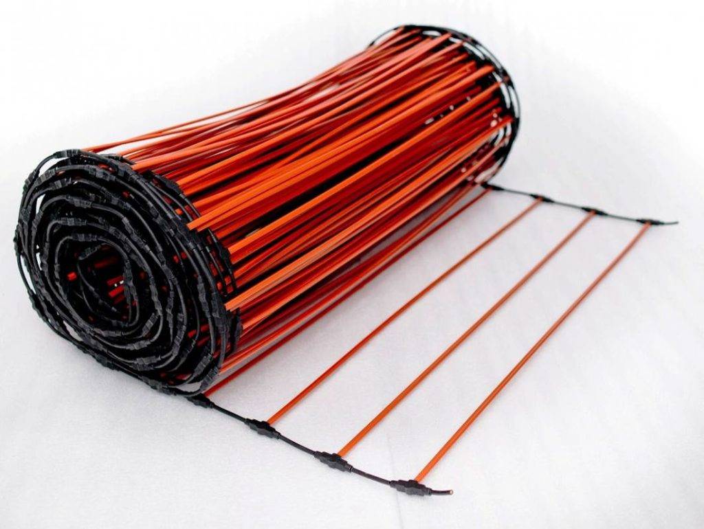 ИК стержневой пол – это эволюция кабельной и пленочной систем. Изготовлен он в виде мата, только вместо двужильного провода здесь идут углеродные инфракрасные стержни. Они выделяют инфракрасное излучение, которое обогревает пол. Монтируются они также под стяжку или клей. Рабочая температура почти такая же, как и у пленки, около 60°С, но вот энергопотребление заметно снижено и составляет в среднем 120 – 160 Вт/м2.