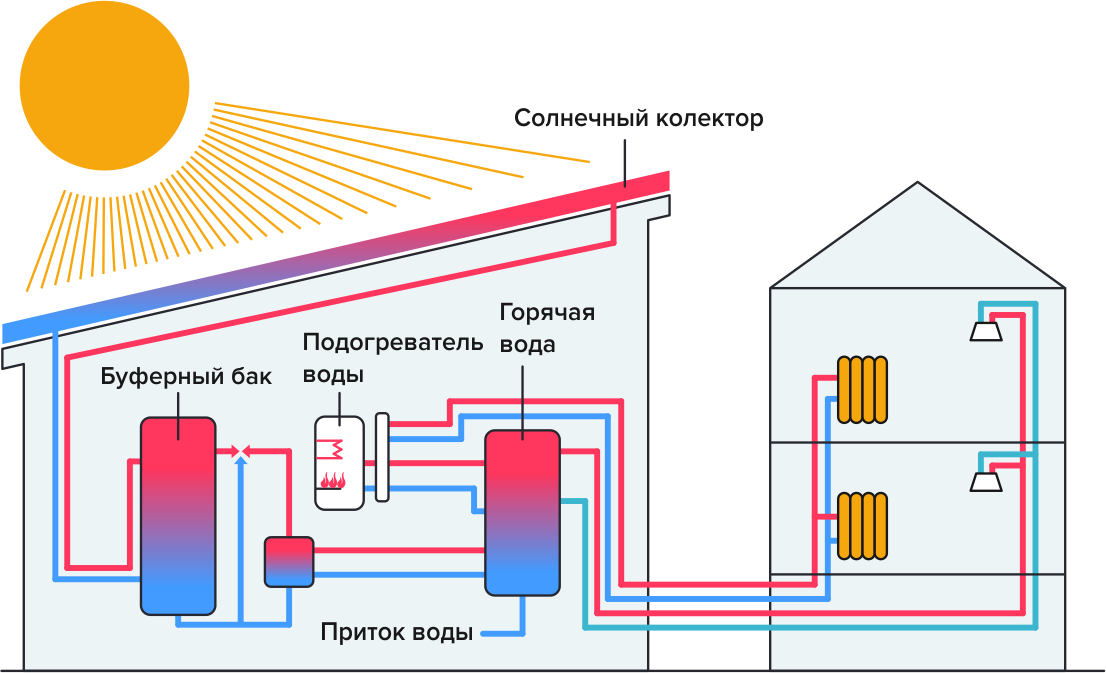 Принцип их работы основан на нагревании солнечными лучами теплоносителя, который циркулирует в солнечном коллекторе с последующей подачей его в бак-аккумулятор, откуда тепло подается в систему отопления или горячего водоснабжения дома.