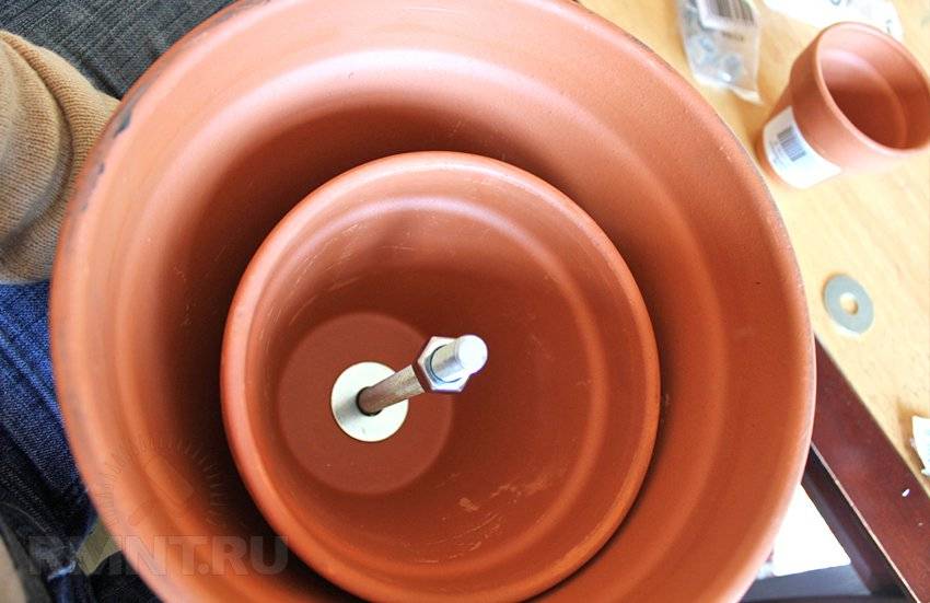 - Затем взять меньший горшок и надеть на болт, зафиксировать шайбой и гайкой.
