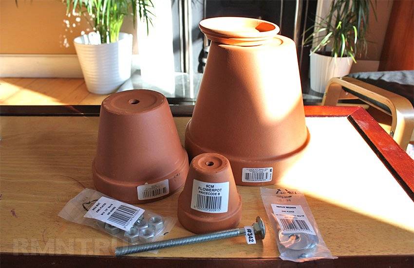 - Шайбы под шпильку с наружным диаметром, равным внутреннему диаметру дна наименьшего горшка — 20 шт. Гайки 7-8 шт.