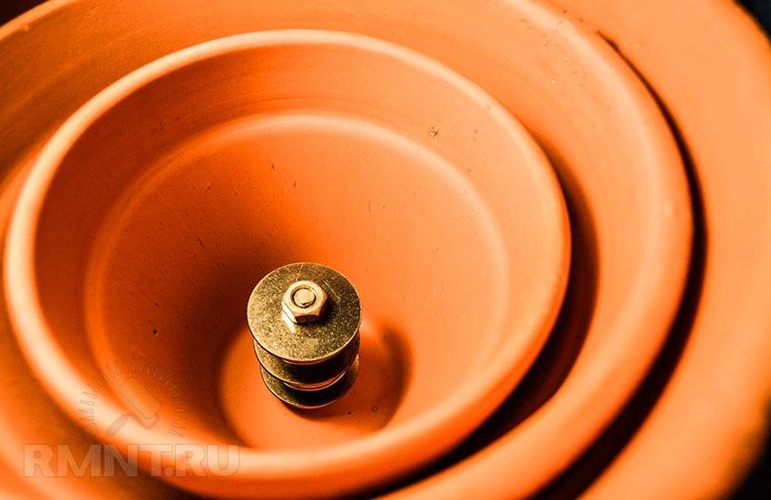 Сборка прибора производится по принципу матрёшки, то есть нужно подбирать так, чтобы они входили друг в друга, и между ними оставался зазор. В дренажное отверстие горшка нужно вставить болт, предварительно одев на него шайбу.