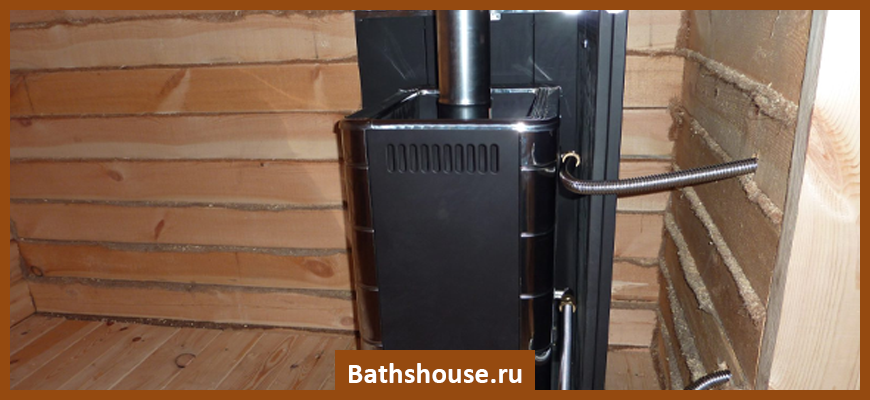 - На банную печь монтируется дымоходная труба, которая выводится через потолок. Место соединения защищается металлическим листом.
