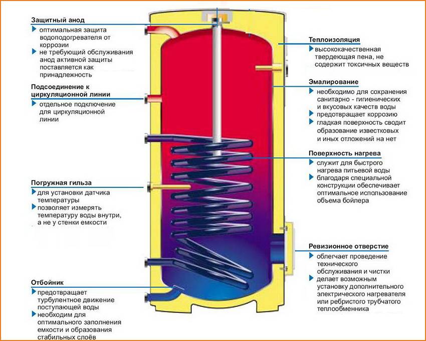 Если резервуар не оснастить собственным циркуляционным насосом, в случае монтажа вверху то движение теплоносителя остановится. Не лишним будет и монтаж электрического нагревателя, его установить достаточно просто в отличие от внутренних теплообменников.