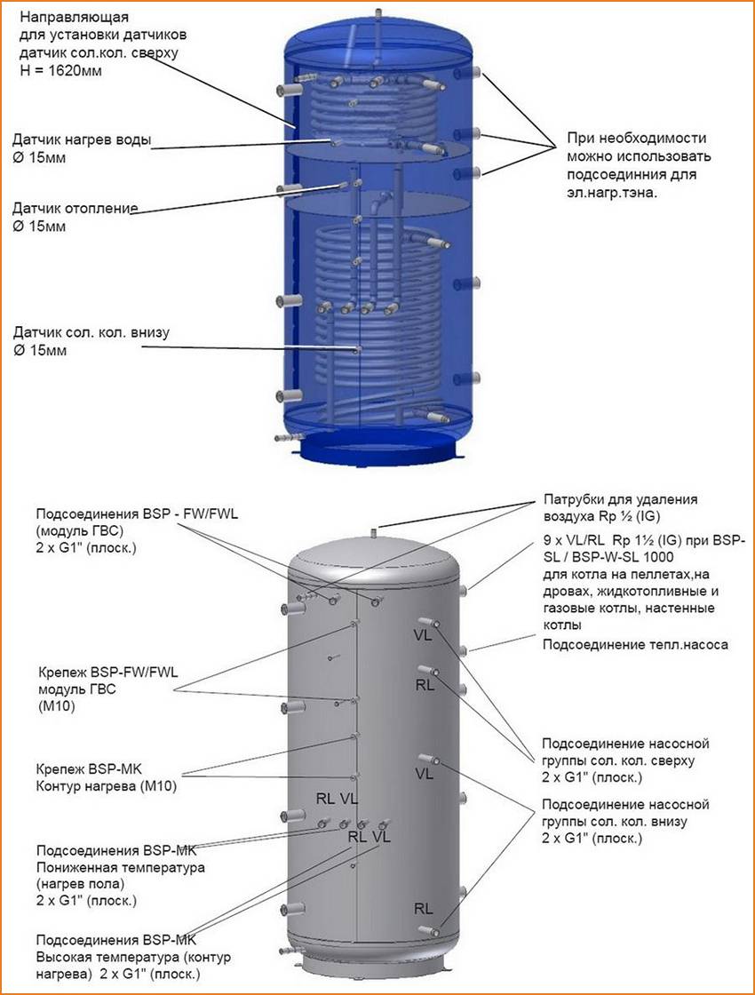 Используемые буферные емкости выполняют сходную функцию, но при этом они имеют свои конструкционные особенности. На сегодняшний день наибольшее распространение получили три типа аккумулирующих тепло баков: