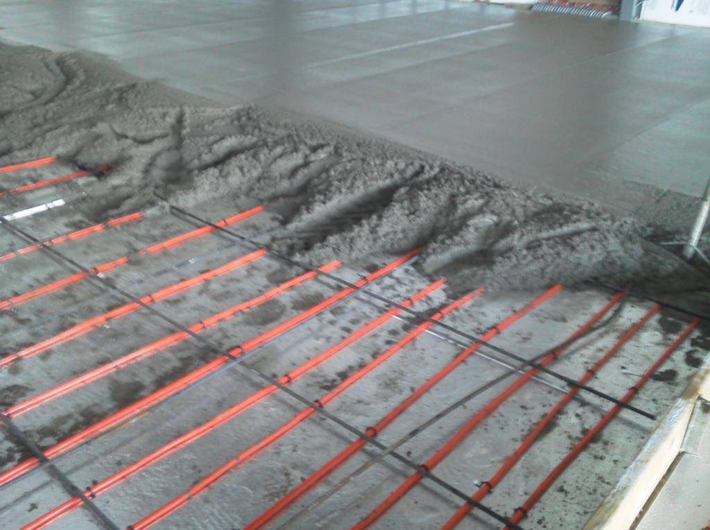 В первом случае лучше вначале выровнять основание пола, а затем монтировать и заливать трубы отопления, что позволит более эффективно отапливать помещение. Во втором случае заливка стяжки на теплый водяной пол не должна превышать 17 см — более толстый слой заливать бессмысленно. В России максимальный размер стяжки заливают в гараже и на проблемных грунтах при строительстве частного дома.