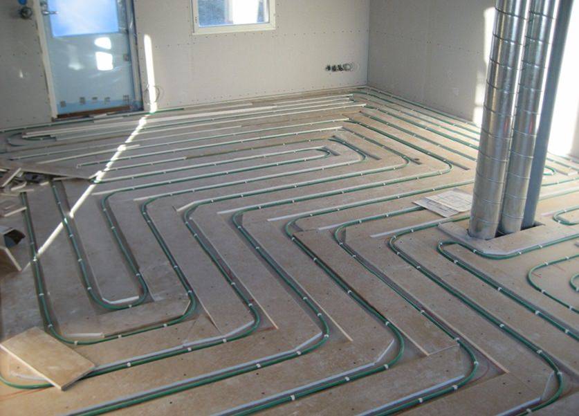 Тёплый водяной пол можно сделать и без бетонной стяжки, сухим способом. Однако такой метод может грозить потерей тепла, так как древесина плохо его проводит. Чтобы этого избежать проводят следующие действия,