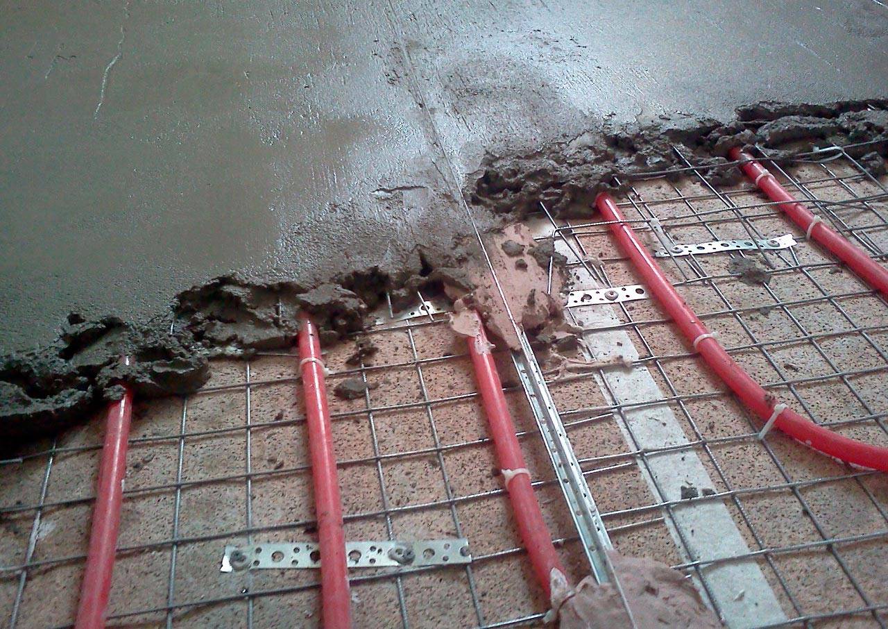 - Затем можно выполнить укладку армирующей сетки, которая требуется для крепления системы. Для трубопровода отводится сеть компенсационных швов, их защищают дополнительно гофрой. Также для придания конструкции лучшей жесткости в некоторых случаях сетку укладывают сверху труб еще одним слоем.