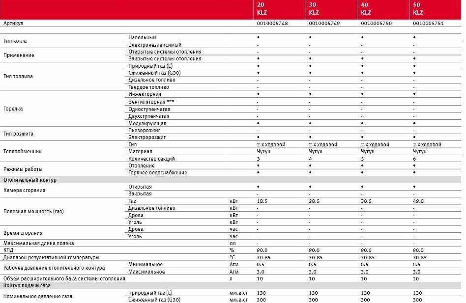 У KLZ17 различия между версиями сравнительно невелики: 20-й вариант имеет 3 секции, 30-й — уже 4, у 40 KLZ17 есть 5 секций, а у 50 KLZ17 — все 6. На КПД это не отражается – он везде равен 90%. Рекомендуемая вместимость расширяющего бака составляет 10 л. Системы оснащаются встроенной индикацией неполадок, есть функции Thermolink P, S.