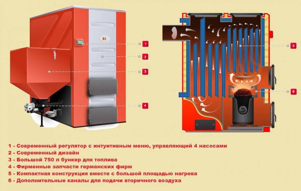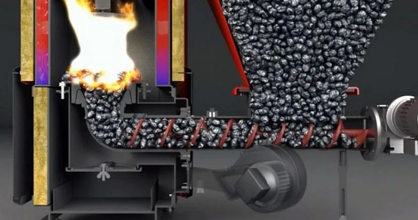 Конструкцией котла предусмотрена загрузка пеллетов с помощью шнекового механизма, а наличие надувной вентиляционной системы делает его востребованным для северных регионов с суровыми зимами.