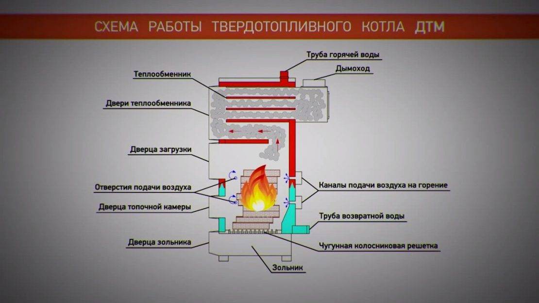 Внутри монтируют чугунный или стальной теплообменник, нагревающий воду, которая затем циркулирует по трубам и подается в контур ГВС. Блок управления устанавливают сверху, чтобы защитить от попадания пыли. Там же оборудуют вентилятор, нагнетающий воздух в топочный отсек.