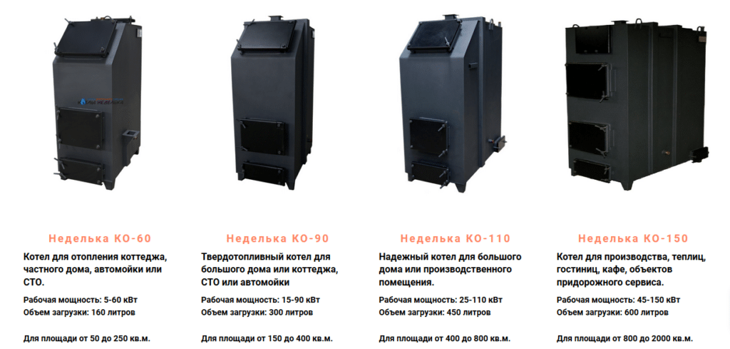Компания Неделька предлагает четыре варианта котлов с различной мощностью, предполагающие отопление помещений разной площади: 50-250 кв.м., 150-400 кв.м., 400-800 кв.м., 800-2000 кв.м.