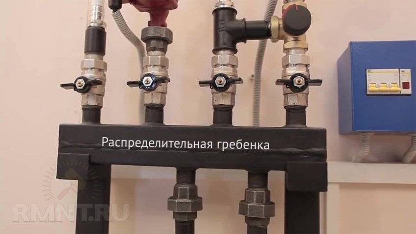 1. Распределительная «гребёнка» — коллектор, по которому распределяется нагретая вода. Рассчитывается, изготавливается и монтируется вместе с системой. Из неё выводятся контуры отопления и горячего водоснабжения.