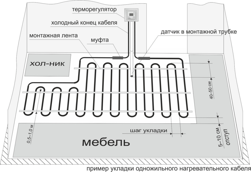 До начала монтажных работ составляется схема укладки. На ней изображается размещение кабеля (матов), место подключения терморегулятора. В схеме учитывается рекомендованный отступ от стен на 50-100 мм. Отмечаются участки, занимаемые мебелью без ножек, на которых нельзя располагать нагревательные элементы.