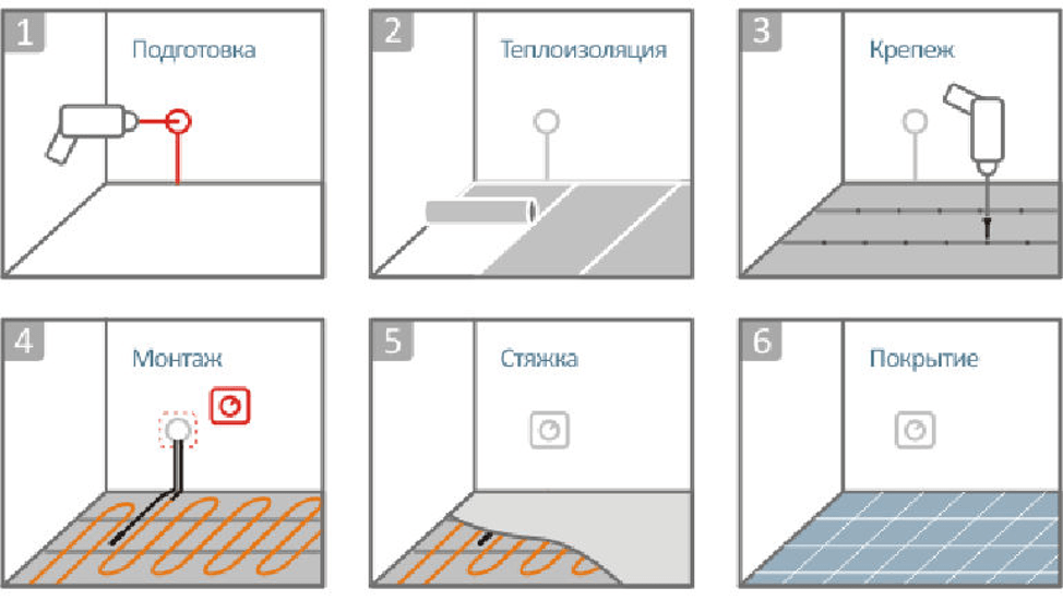Кроме провода с двойной изоляцией, любая кабельная система также включает терморегулятор и температурный датчик. Особенностью реализации кабельного теплого пола является необходимость его монтирования в стяжку под напольным покрытием или в плиточный клеящий состав.