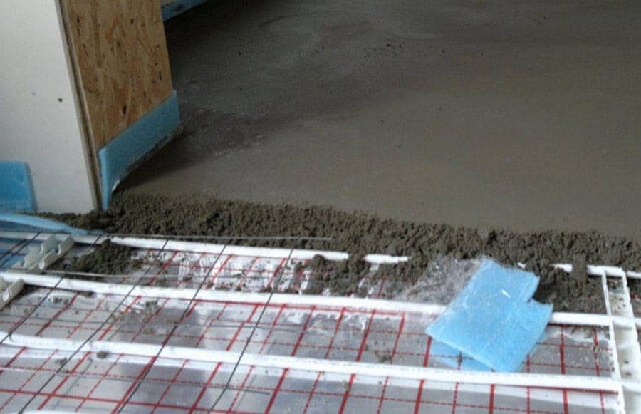 После этого смонтированную поверхность пола необходимо залить бетонной стяжкой, благодаря которой тепло будет равномерно распределяться по всей площади помещения. Стяжка должна располагаться выше труб не выше, чем на 15см, но и не ниже, чем на 3см.
