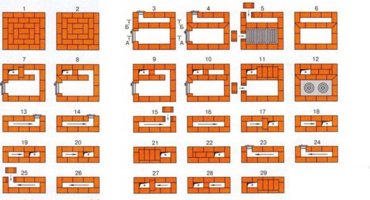 5. Там, где выстраиваются пазы для плит из металла (стальных или чугунных), необходимы врезы на кирпичной кладке. Если есть несколько видов топок, то стараются стенки проложить шамотным видом кирпича. Это дорого, но долговечно.
