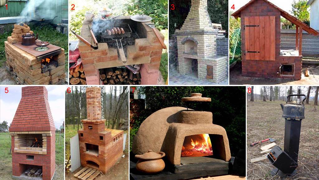Посмотрим для начала, какую возможно построить печь на улице с учетом того, что топиться она будет не интенсивно и нерегулярно, зато будет подвергаться климатическим воздействиям, зимой промерзать, а снабдить ее высоким дымоходом будет сложно. Но и опасность от распространения угарного газа из уличной печи сводится к минимально возможной, хотя и не устраняется совсем, особенно в беседке, под навесом и в безветренную погоду. Не забывайте об этом: печи, которую можно было бы топить как попало, не боясь угара, не существует. Угореть можно, и просто сидя у костра.