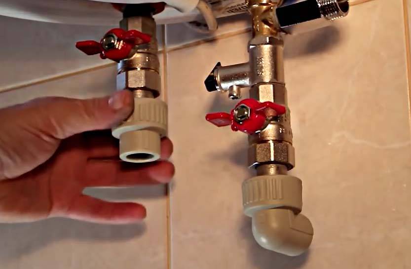 Если в дом заходит также трубопровод с горячей водой, то помимо подключения подачи на нагреватель от трубопровода с холодной водой, потребуется установка дополнительных двух запорных кранов и одного тройника.