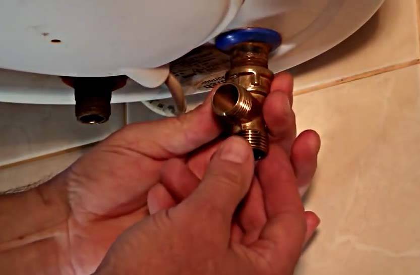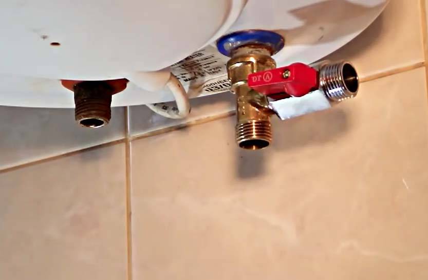Входной патрубок на бойлере маркируется синим цветом. На него нужно смонтировать предохранительный клапан, он дает возможность сбрасывать излишнее давление. Для удобства техобслуживания желательно на отвод нагревателя поставить тройник, а к нему прикрутить отсекающий вентиль. Он даст возможность по мере необходимости сливать воду из емкости.