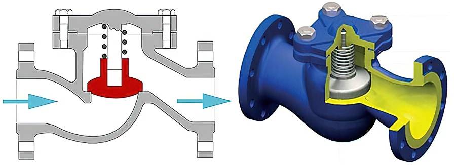 - Подъемные и поворотные клапаны имеют в конструкции подпружиненные заслонки. Такие устройства сравнительно крупногабаритные, тяжелые и не дешевые. Преимущество – возможность легко выполнить разборку для очистки, регулировки и мелкого ремонта.