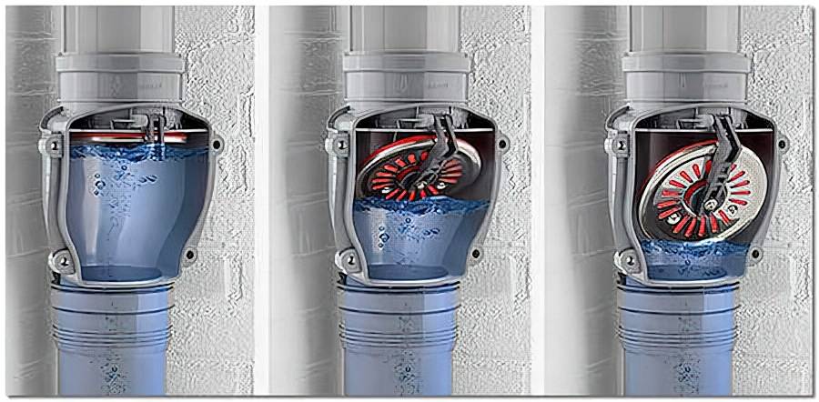 В спокойном состоянии при горизонтальном монтаже хлопушка закрыта и открывается, когда в систему попадают стоки из сантехнических приборов. Если произошел засор, переполнение и вода хлынула вверх, дроссель закрывается и перекрывает доступ.