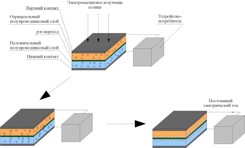 При попадании на один из наружных слоев солнечного света создается фотогальванический эффект, что приводит к формированию в этом слое свободных электронов. Данные частицы получают вспомогательную энергию и способны преодолеть внутренний слой элемента, который в данном случае именуется барьером. Чем больше объем солнечного света, тем сильнее происходит процесс прохождения или перепрыгивания электронов от одной наружной пластины к другой, минуя внутреннюю перегородку. При замыкании наружных пластин возникает напряжение. Та пластина, которая усиленно отдает частицы, создает в себе так называемые дырки, обретает знак минус, а которая принимает, обретает знак плюс.