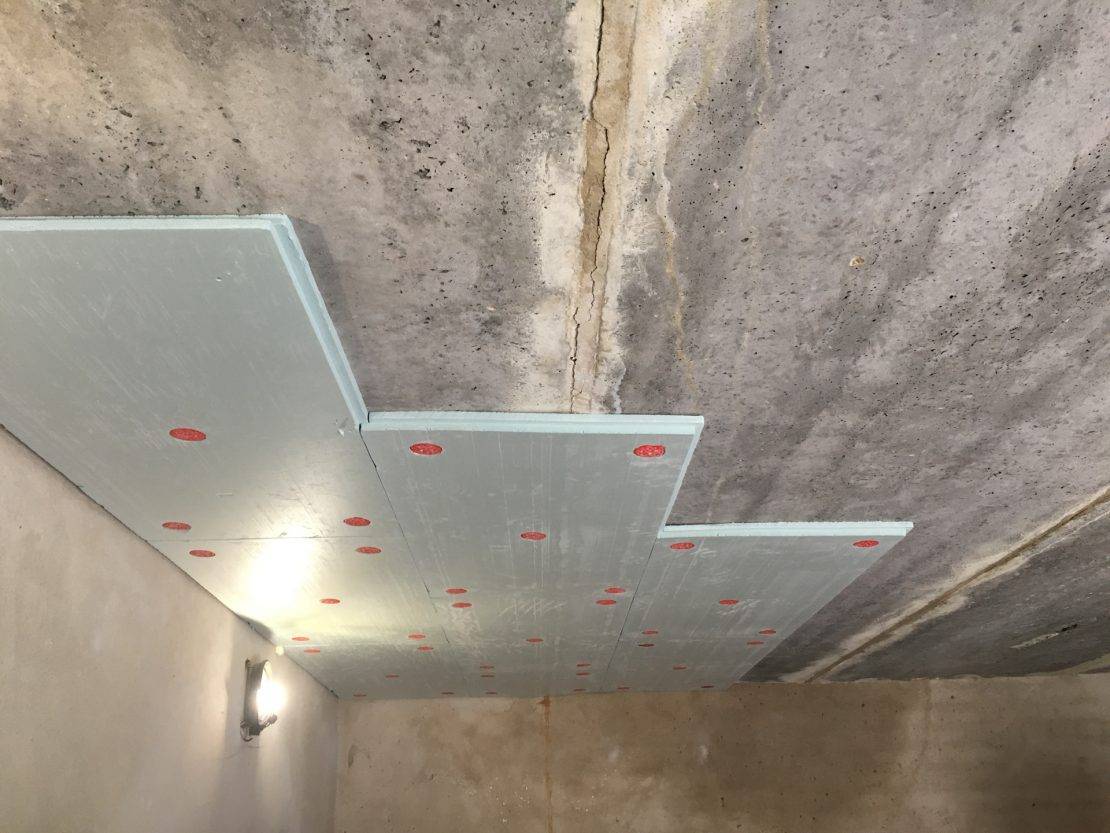 - Как только грунт просохнет, разметить потолок по размерам листов утеплителя. Принцип разметки такой: подрезаемые листы укладываются по краям, в центре потолка всегда монтируются целые элементы.
