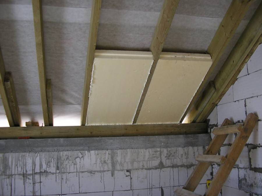 Утепление готовой плоской кровли или потолка производится изнутри пенопластом на клею. Т. к. потолок не подвержен каким-либо механическим воздействиям, пенополистирол можно принять марки ПСБ-15 и минимальной толщиной — 50 мм.